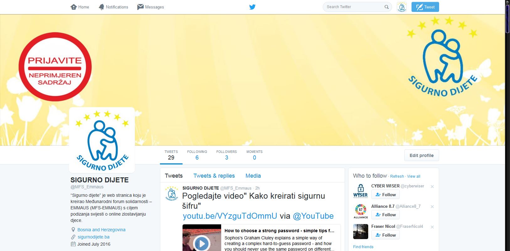 “Najnovijim aktivnostima pokušavamo animirati javnost, posebno djecu i podstaći sve one koji su on-line da vrše prijave neprimjerenog sadržaja i posjećuju stranicu www.sigurnodijete.ba. Seksualno zlostavljanje djece u svrhu izrade pornografskog materijala i ostali vidovi uznemiravanja djece i mladih neprimjerenim sadržajima posredstvom interneta i mobilne telefonije je nažalost postala naša svakodnevnica. Sve to se dešava ovdje i sada, a žrtva može biti bilo ko. U tom smislu, uz stranicu sigurnodijete.ba, ponovno smo aktivirali Facebook stranicu Sigurnodijete, kao i Twitter nalog, kako bismo najprije informirali javnost, a onda i djelovali na suzbijanju ovog problema”, izjavila je Amela Efendić šef MFS – EMMAUS ureda u Sarajevu i menadžer EURC-a (Europski resursni centar).
