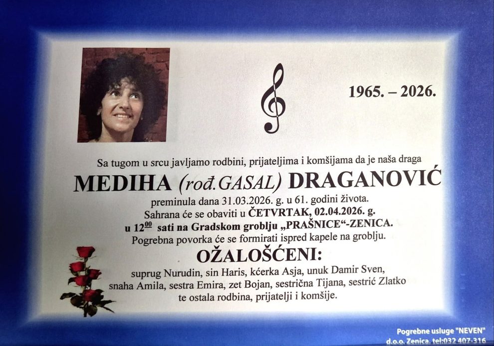Jučer smo obavjestili NA OVOM LINKU da je naša sugrađanka Mediha (rođ. Gasal) Draganović preminula 31. marta 2026. godine u 61. godini života.