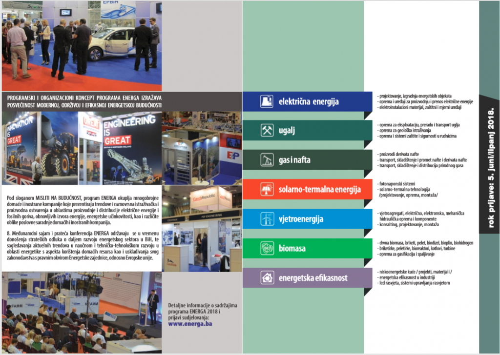 Sarajevo će tokom Međunarodnog sajma i konferencije ENERGA 2018 biti regionalni energetski centar na kojem će se okupiti više od 100 izlagača iz 15 zemalja kako regije tako i svijeta, a koji će predstaviti proizvode, projekte, ideje i usluge svojih kompanija. ENERGA se održava pod sloganom MISLITI NA BUDUĆNOST / THINKING THE FUTURE.
