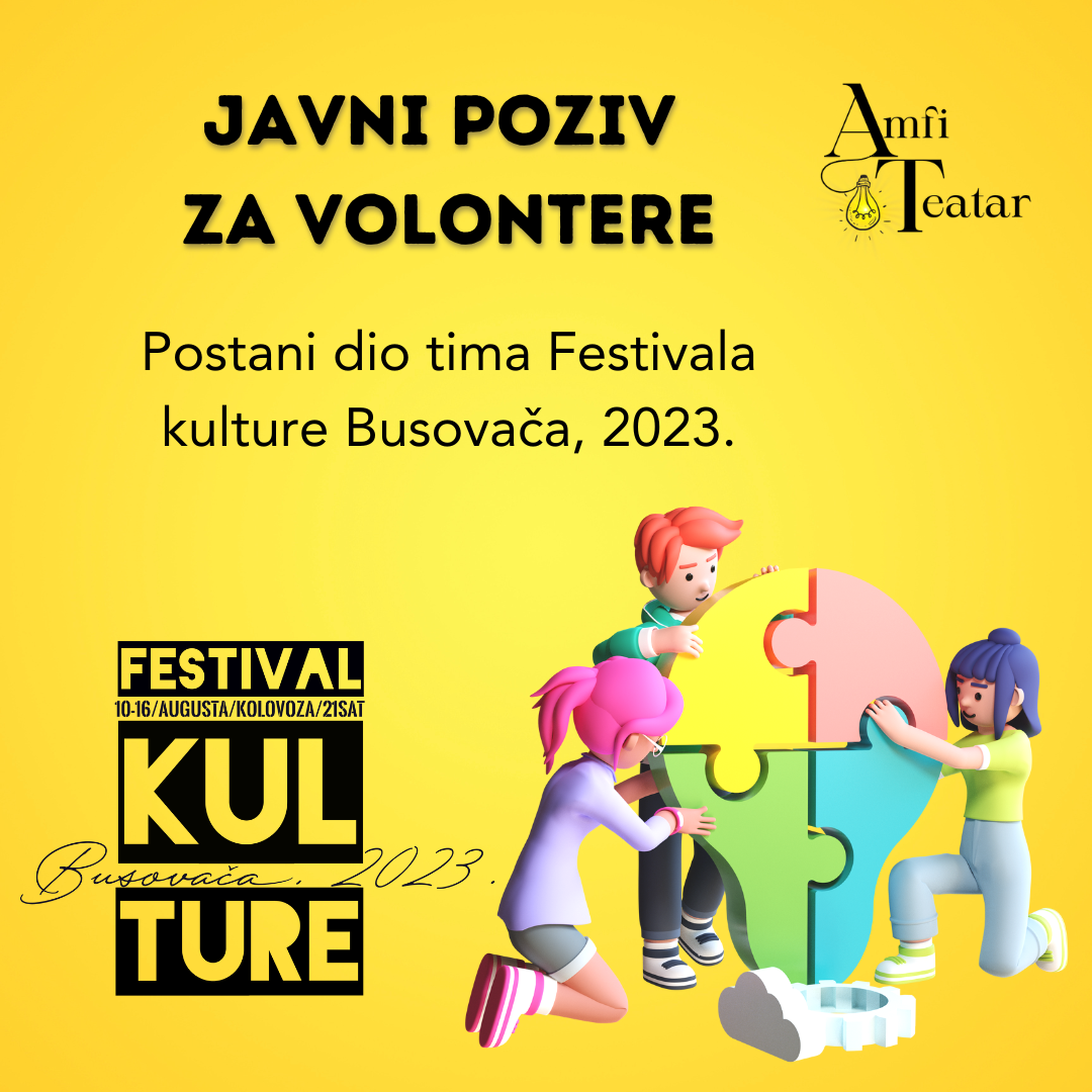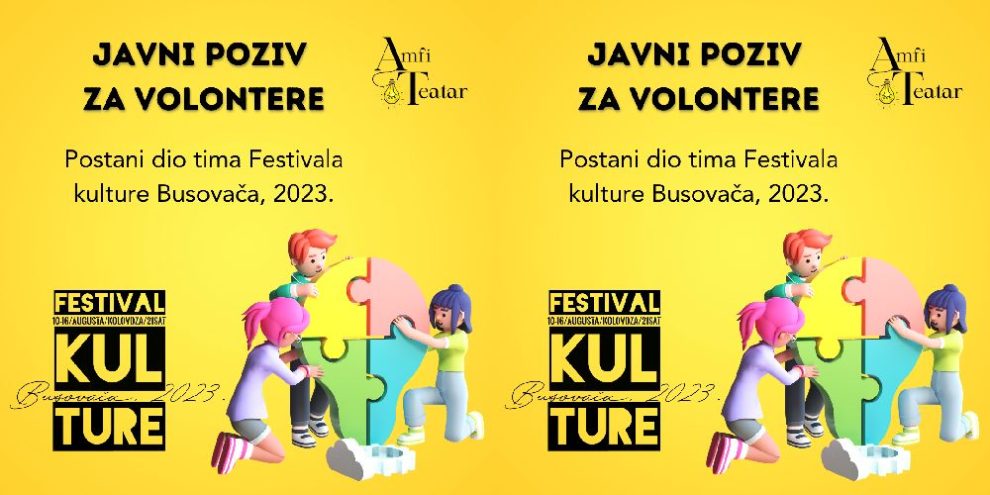 Ukoliko ste kreativni i želite ljeto pretvoriti u nezaboravnu zabavu, ovo je odlična prilika za vas. AmfiTeatar Busovača raspisuje javni poziv za kreativni volonterski tim trećeg po redu Festivala kulture, Busovača 2023., a na isti se mogu prijaviti svi zainteresovani starosne dobi od 16 do 30 godina. Zainteresovani treba da ispune kratki aplikacijski obrazac, nakon čega, ukoliko budu pozvani, slijedi nezaboravna zabava i druženje uz koncerte, predstave, filmove, plesne zabave i druge festivalske sadržaje.