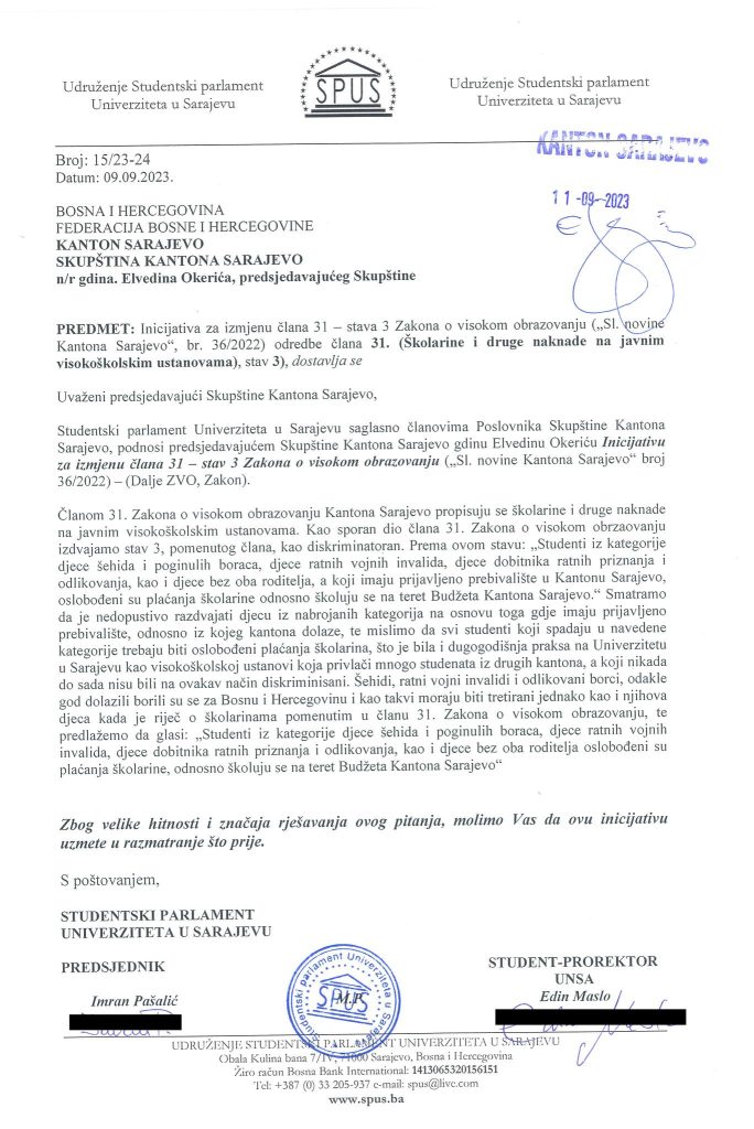 Još uvijek nismo dobili odgovor iz Kantona. Ovakve stvari ne možemo prihvatiti. Mali broj je studenata koji pripadaju navedenim kategorijama, tako da ne mislimo da bi u tom slučaju budžet bio znatno oštećen, štaviše, taj iznos bi bio manji nego ranije. Ovdje je prvenstveno odgovornost na federalnom Ministarstvu obrazovanja, jer oni trebaju formirati spisak studenata koji spadaju u navedene kategorije. Kanton Sarajevo nije dužan finansirati te studente, nego bi federalno ministarstvo to trebalo preuzeti što je slučaj bio do sada. S obzirom da je ista koalicija i na federalnom i na kantonalnom nivou, vjerujemo da će proraditi svijest rukovodilaca i da ćemo naći zajedničko i prihvatljivo rješenje za sve – kazao je.