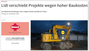 Prema njihovim saznanjima, Lidl reaguje na dramatično povećane troškove gradnje u Njemačkoj i drugim zemljama stopiranjem novih tendera. Broj novih otvaranja Lidl prodavnica će se kao posljedica toga smanjiti.