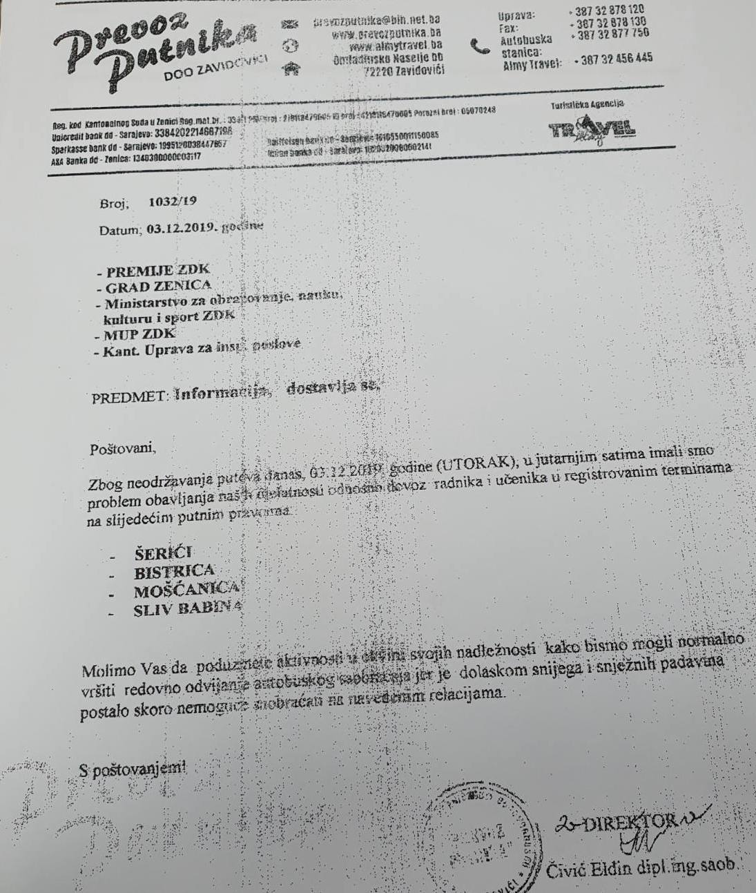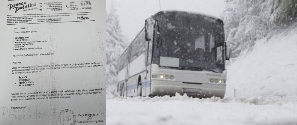 Prema faksmilu dopisa u čijem posjedu je redakcija Zenicabloga, jutros je iz preduzeća Prevoz putnika, koje obavlja prijevoz učenika i radnika na području nekoliko zeničkih naselja, na adresu Gradske uprave, premijera, ministra obrazovanja, komesara i ministra policije, te kantonalne Uprave za inspekcijske poslove upućen dopis – informacija, o nemogućnosti obavljanja regularnog prijevoza učenika i radnika na putnim pravcima u području Šerića, Bistrice, Mošćanice i sliva Babine.