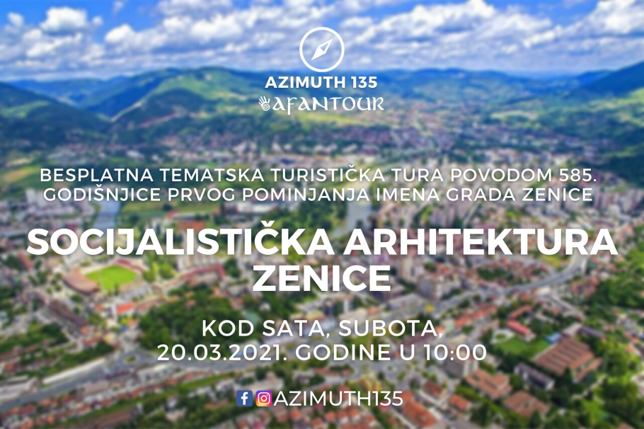 Povodom 585. rođendana grada Zenice- turistička tura “Socijalistička arhitektura Zenice”- U povodu 585. rođendana grada Zenice, organizujemo tradicionalnu besplatnu tematsku turistički turu “Socijalistička arhitektura Zenice”. Poklon je to gradu, sugrađanima, ali i gostima, peti put zaredom, od turističkog i planinarskog vodiča Afana Abazovića.