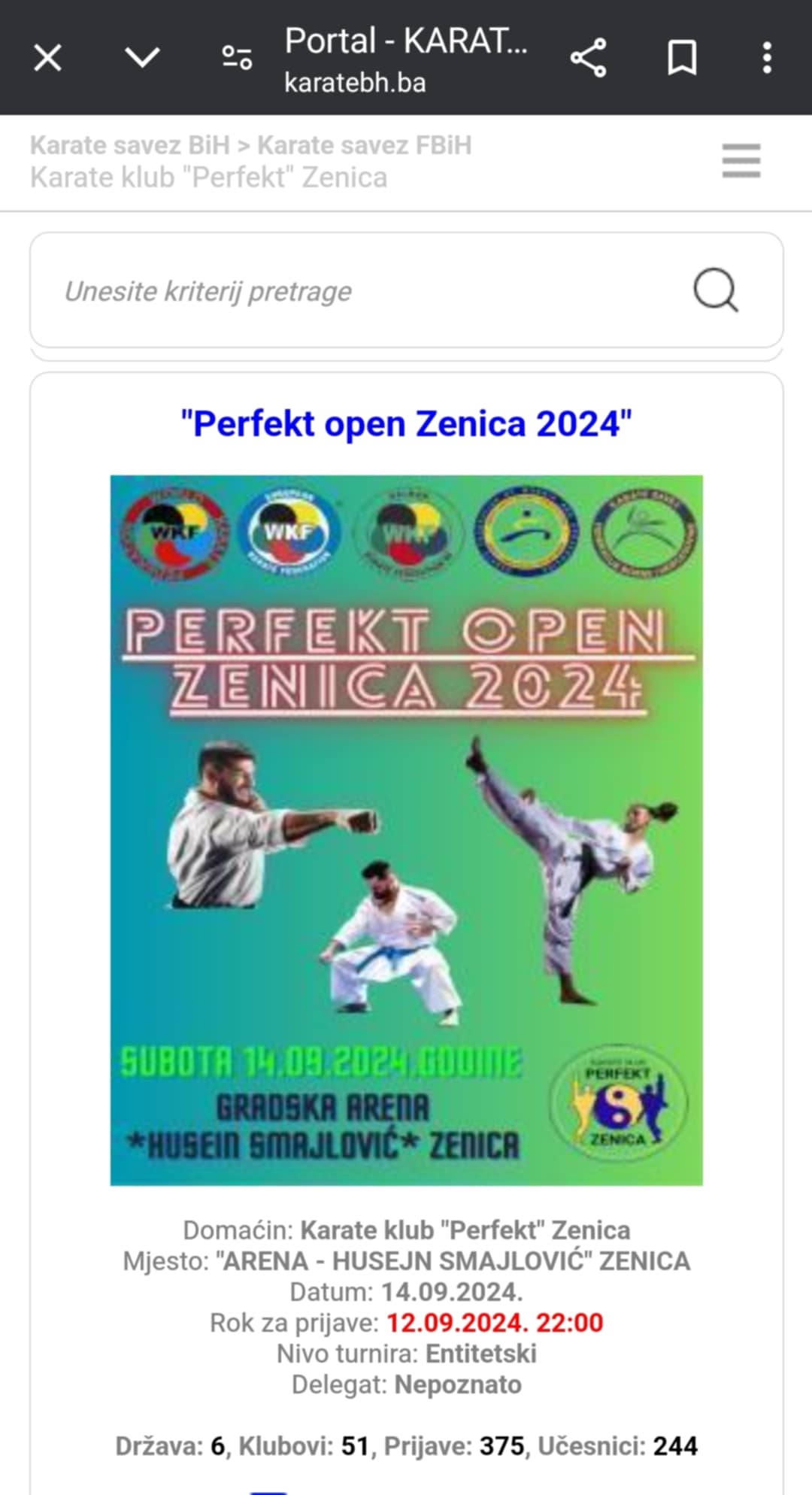 Sve prijave na turnir idu preko zvaničnog portala karate saveza Bosne i Hercegovine karatebh.ba , trenutno imamo prijave iz 6 država / Belgija, Slovenija, Hrvatska, Srbija, Crna Gora i Bosna i Hercegovina ) i 51 klub.