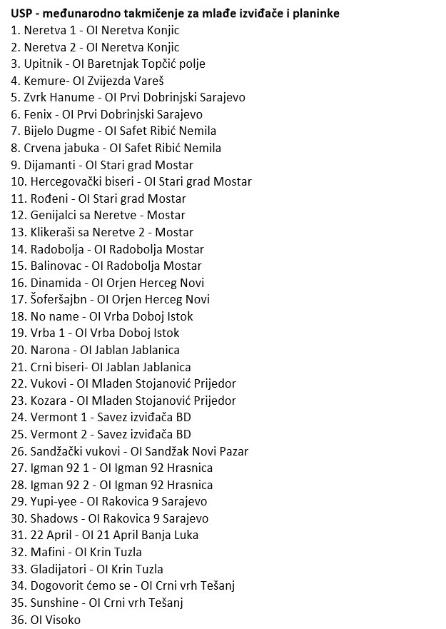 Do sada je prijavljeno ukupno 78 ekipa: 42 ekipe u kategoriji takmičenja za mlađe izviđače “U susret proljeću”, 19 ekipa sa “Zeničko orjentaciono takmičenje “ZOT”, 11 ekipa za takmičenje gradskog saveza i 6 ekipa u konkurenciji eko sekcije osnovnih škola.