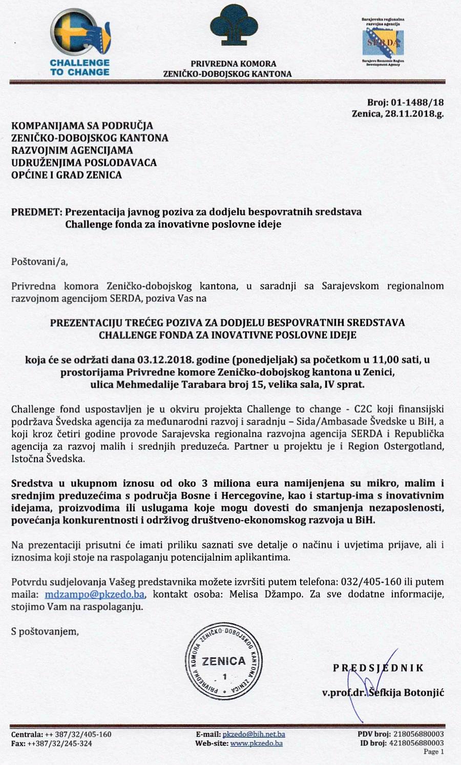 Poziv na prezentaciju dodjele bespovratnih sredstava Challenge fonda za inovativne poslovne ideje – Kompanijama sa područja Zeničko-dobojskog kantona, Razvojnim agencijama, Udruženjima poslodavaca općinama i Gradu Zenica upućuje se Poziv na prezentaciju dodjele bespovratnih sredstava Challenge fonda za inovativne poslovne ideje, koja će se održati u ponedjeljak, 3. decembra sa početkom u 11,00 sati, u prostorijama Privredne komore Zeničko-dobojskog kantona u Zenici, ulica Mehmedalije Tarabara broj 15, velika sala, IV sprat.