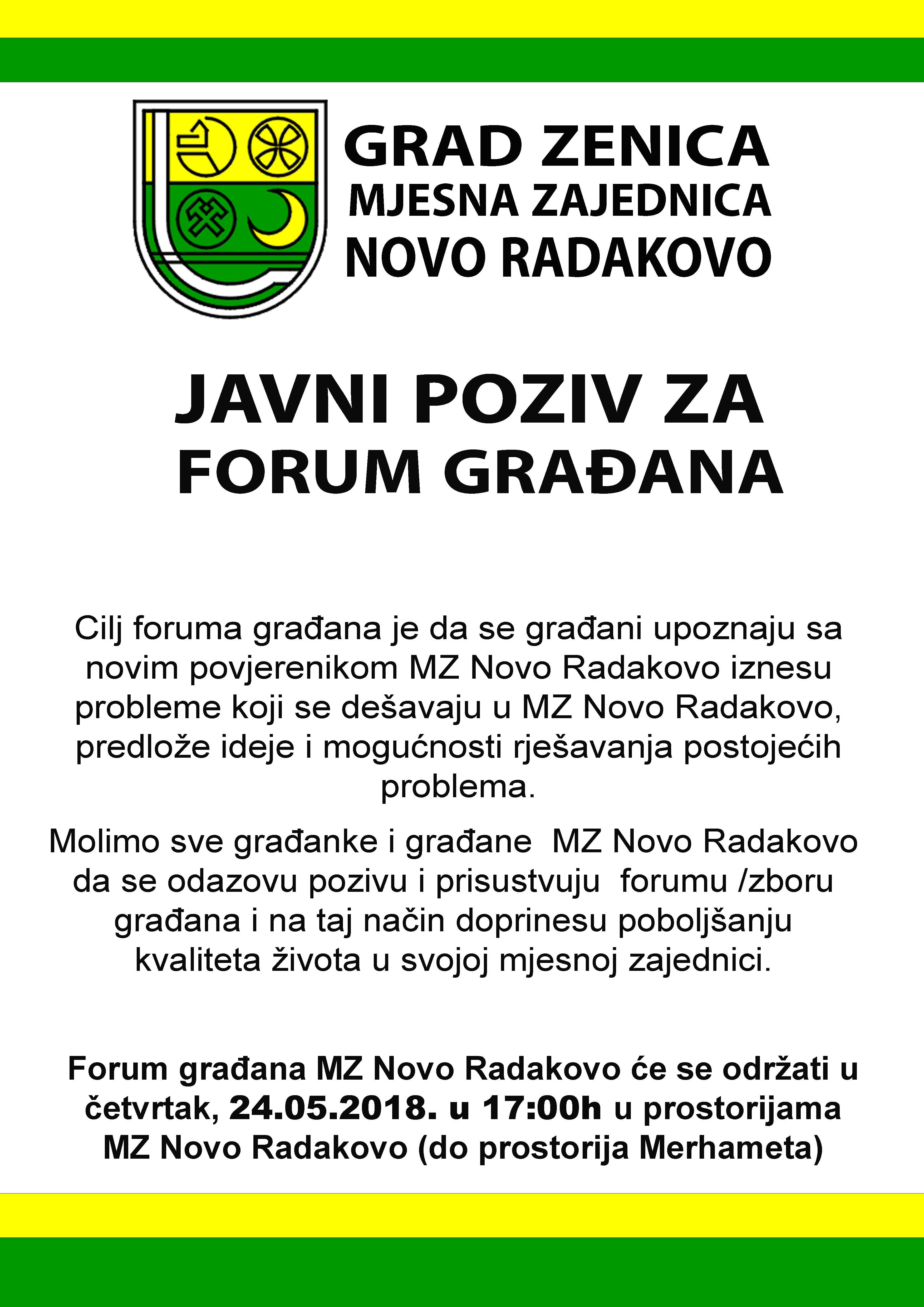 Poziv na zbor/forum građana MZ Novo Radakovo – Pozivamo sve mješane Mjesne zajednice Novo Radakovo da se odazovu formu/zboru građana koji će se održati u četvrtak 24.05.2018.godine u 17h u prostorijama MZ Novo Radakovo (kod prostorija Merhameta)