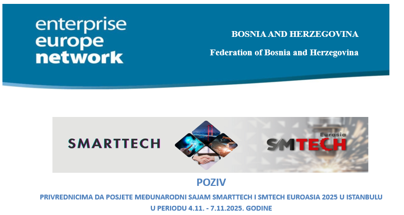 Zenička razvojna agencija ZEDA d.o.o. sa Willdich – Business Centre, partnerima iz Turske – Privredna komora Istanbula i EEN partner – Istanbulska industrijska komora, organizuju posjetu privrednika iz Bosne i Hercegovine međunarodnom sajmu SMARTTECH I SMTECH EUROASIA 2025 u Istanbulu u periodu 4.11. – 7.11.2025. godine.