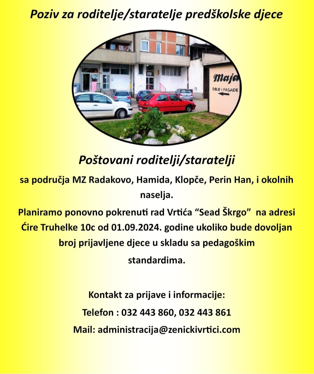 Iz Javne ustanove za predškolski odgoj Zenica uputili su Poziv za roditelje/staratelje predškolske djece sa područja MZ Radakovo, Hamida, Klopče, Perin Han, te okolnih naselja.