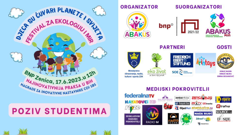 Pozivaju se studenti volonteri Univerziteta u Zenici, koji žele biti dio naše velike manifestacije Festival za ekologiju i mir “Djeca su čuvari planete i svijeta”, steći značajno iskustvo, praktična znanja i vještine, da nam se prijave slanjem maila na [email protected] do 13.6.2023.godine.