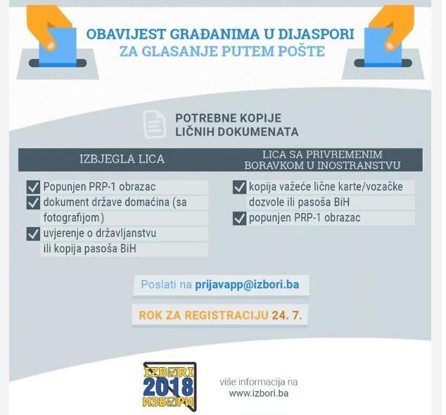 Poziv za državljane BiH u dijaspori: registracija za glasanje putem pošte do 24.jula – Federalni ministar izbjeglica i raseljenih osoba Edin Ramić pozvao je danas državljane Bosne i Hercegovine u inostranstvu da se registruju za glasanje putem pošte do 24. jula i iskoriste svoje glasačko pravo na općim izborima.