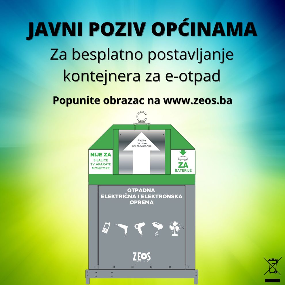 Obavještavamo općine Federacije Bosne i Hercegovine da je ZEOS eko-sistem d.o.o., izdvojio sredstva za nabavku novih kontejnera za električni i elektronski otpad (u daljem tekstu e-otpad), koji će biti postavljeni besplatno u općine koje iskažu interes i izdaju potrebne saglasnosti za postavljanje i lokacije kontejnera.