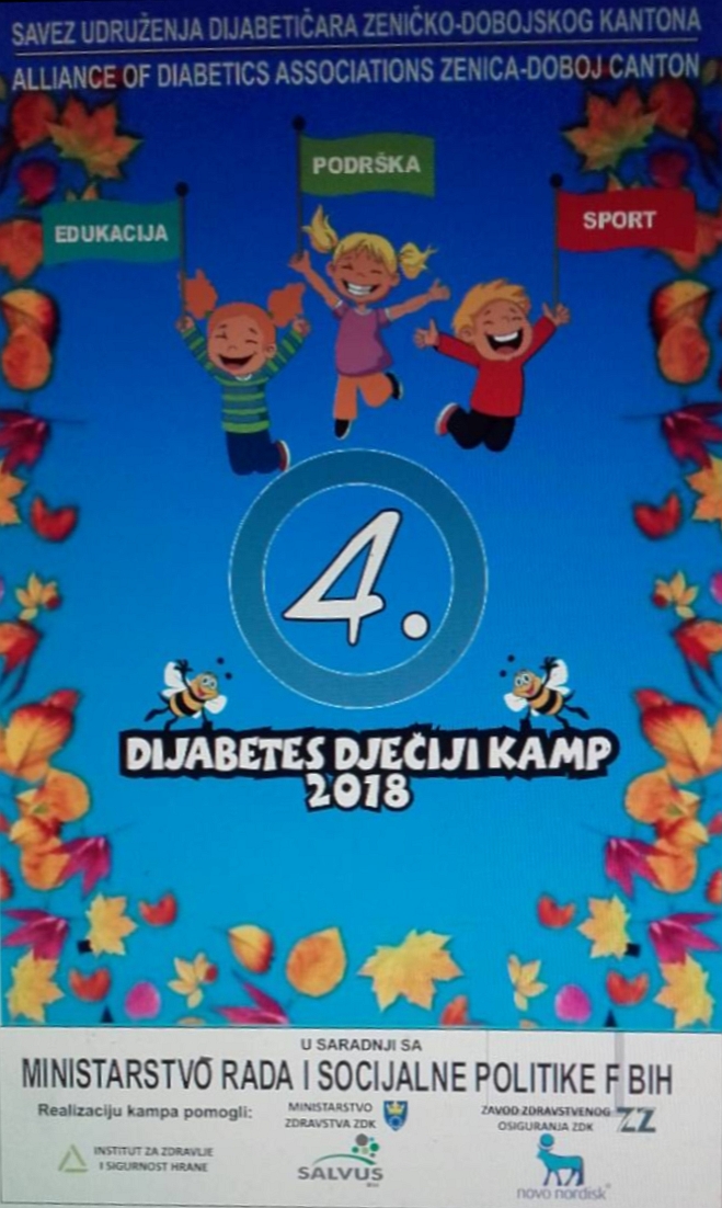 Poziv za prijave učešće za prijave za učešće na četvrtom Dijabetes dječijem kampu – Savez udruženja dijabetičara Zeničko-dobojskog kantona organizuje Četvrti dijabetes dječiji kampa koji će se održati od 19. do 21. oktobra 2018. godine u Sportsko-rekreacionom centru “Ajdinovići” kod Olova. Kamp se organizuje u saradnji sa Ministarstvom rada i socijalne politike Federacije BiH, te podršku Ministarstva zdravstva ZDK, Zavoda zdravstvenog osiguranja ZDK, Instituta za zdravlje i sigurnost hrane Zenica i farmaceutskih kuća „Salvus“ i „Novo Nordisk“.