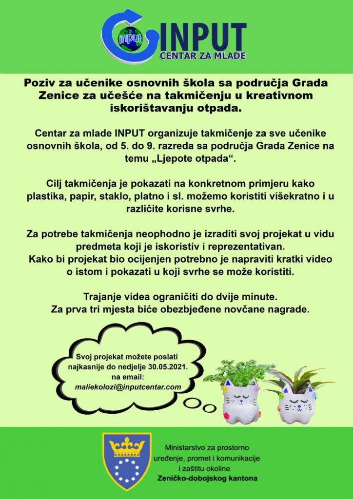 Poziv za takmičenje u kreativnom iskorištavanju otpada- U okviru projekta “Mali ekolozi, veliki poduhvati” Centar za mlade INPUT organizuje takmičenje za sve učenike osnovnih škola, od 5. do 9. razreda sa područja Grada Zenice na temu „Ljepote otpada“. Cilj takmičenja je pokazati na konkretnom primjeru kako plastika, papir, staklo, platno i sl. možemo koristiti višekratno i u različite korisne svrhe.