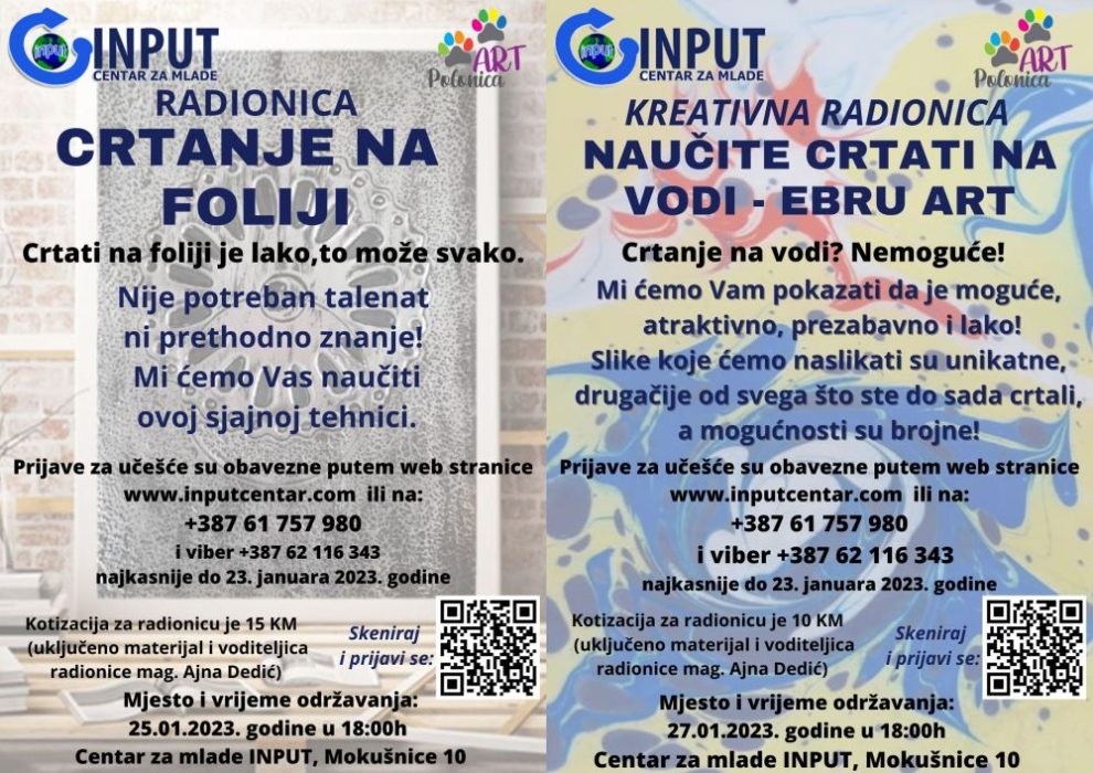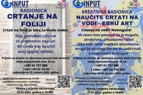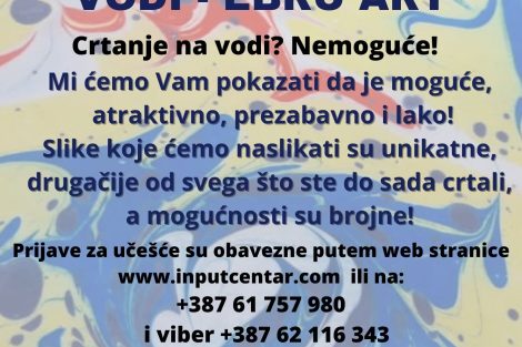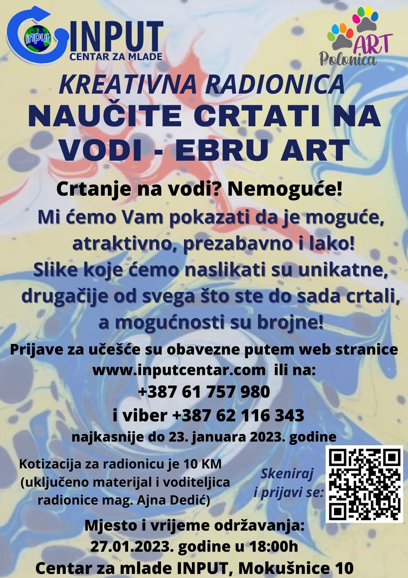 Dana 27. januara 2023. godine, Centar za mlade INPUT u saradnji sa Polonica ART organizuje kreativnu radionicu „EBRU ART“ koja će početi u 18:00 u Centru za mlade INPUT na Mokušnicama (Mokušnice 10) Zenica.