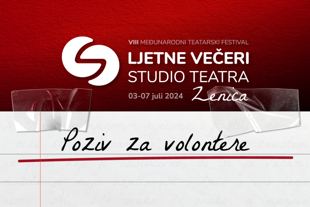 Studio Teatar poziva mlade od 16 do 26 godina da se prijave i postanu dio kreativnog volonterskog tima 8. Međunarodnog teatarskog festivala Ljetne večeri Studio Teatra. Ako ste ambiciozni, komunikativni, želite raditi sa uigranim festivalskim timom i volite teatar, ovo je jedinstvena prilika da postanete dio najljepše teatarske priče pod vedrim nebom.