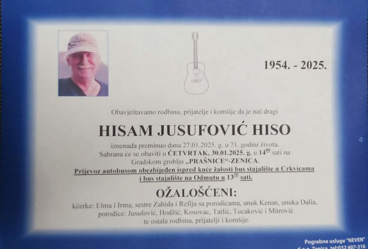 IN MEMORIAM HISAM JUSUFOVIĆ HISO – Zeničanin Hisam Jusufović Hiso preminuo je jučer u 71. godini života.