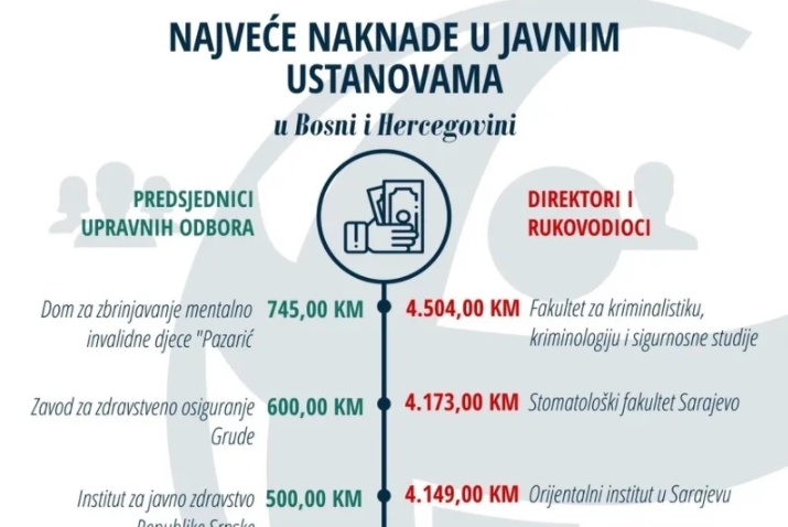 Preliminarni podaci koje je Transparency International u BiH objavio u prvoj bazi javnih ustanova u BIH pokazuju da plate direktora i članova upravnih odbora najčešće idu do zakonom dozvoljenih maksimuma, a neke ustanove su kolektivnim ugovorima dale i veća prava direktorima.