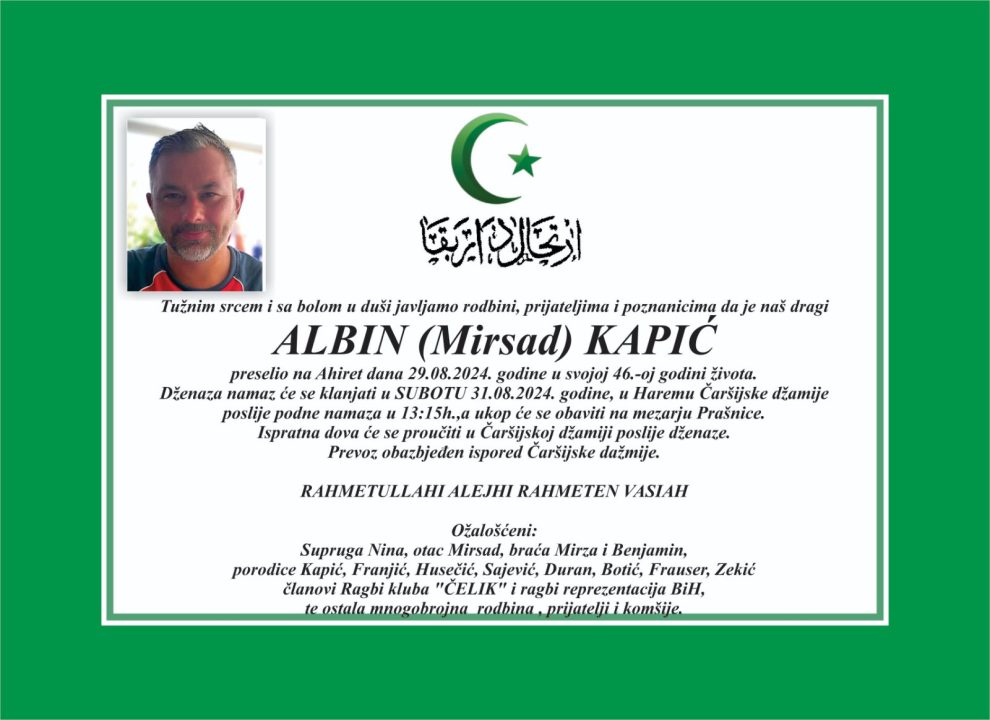 Dženaza uglednom sportskom radniku, treneru i selektoru Albinu Kapiću biće klanjana sutra (subota), potvrđeno je Zenicablogu.