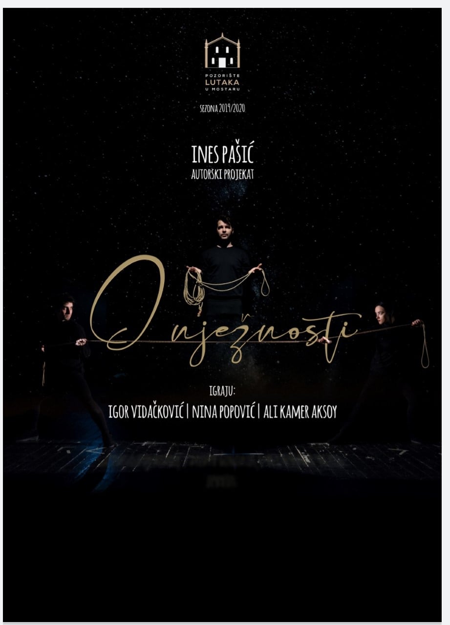 Predstava „O nježnosti“ je nastala u produkciji Pozorišta lutaka Mostar i u režiji Ines Pašić, koja je o predstavi napisala: „’O nježnosti’ je splet scena iz života viđenih iz ugla koji nema ambiciju da donosi sudove ni o komu i ni o čemu. To su svakodnevne situacije pune ‘malih i velikih’ sukoba i proturječnosti humoristične i poetske prirode. Svi ti momenti, iako različiti, imaju nešto zajedničko. To je moć nježnosti koja preobražava tragikomične situacije u katarzično teatarsko i ljudsko iskustvo. Scenske tehnike kojima se glumci služe su tjelesne i ritmičke figure, pantomima i animacija predmeta. Muzička podloga je važan elemenat koji snaži scenski sadržaj. U vrijeme velikih tehnoloških dostignuća mnogi umjetnici imaju potrebu vratiti se iznimnoj jednostavnosti. Ta potraga za suštinskim u zahtjevnoj lutkarskoj i glumačkoj igri je metafora potrage za onostranim u svima nama. Otkriti moć nježnosti i svu njenu duhovnu snagu posebno je iskustvo koje mijenja svijet mijenjajući shvatanje o njemu. Pretočiti tu ideju u scensku igru je izazov koji predstava ‘O nježnosti’ želi istraživati i podijeliti sa publikom.“ U predstavi igraju: Igor Vidačković, Nina Popović i Ali Kamer Aksoy.