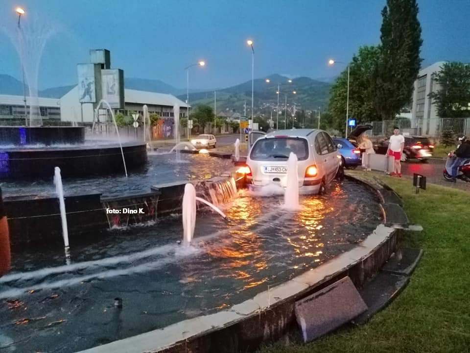 Prečicom, ali na pogrešnom mjestu: “Slovenac” završio u Fontani kod Željezare – Vozač “Renoa” ljubljanskih registarskih oznaka (Slovenija) izgubio je večeras kontrolu nad vozilom, koje je završilo u fontani na Glavnoj gradskoj magistrali kod Stacionara i Željezare, u blizini petlje Blatuša. Prema informacijama sa lica mjesta nije bilo povrijeđenih, ali je vidljiva šteta nastala na fontani. Foto: Dino K.