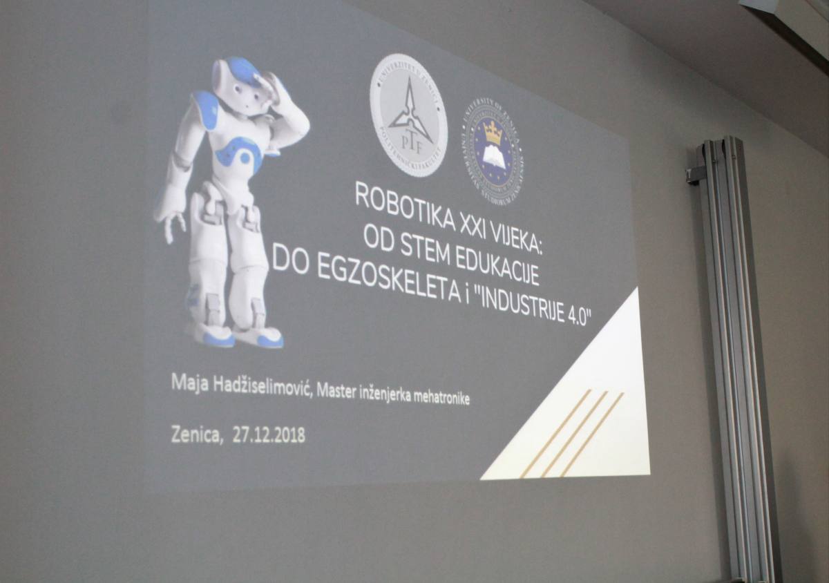 Predavanje Maje Hadžiselimović na Politehničkom fakultetu Univerziteta u Zenici – Jučer je amfiteatar Politehničkog fakulteta bio ispunjen kao nikada do sada na predavanju koje je održala Maja Hadžiselimović na temu „.ROBOTIKA XXI VIJEKA: OD STEM EDUKACIJE DO EGZOSKELETA I INDUSTRIJE 4,0“.