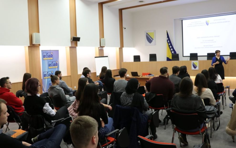 Tema predavanja je bila “Izbori: zakonodavstvo, proces, institucije”.Uvodno izlaganje je održala dr. Irena Hadžiabdić, članica Centralne izborne komisije BiH a Marijana Žuljević, šefica Odsjeka za izbore je prezentirala karakteristike izbornog sistema i procesa u Bosni i Hercegovini.