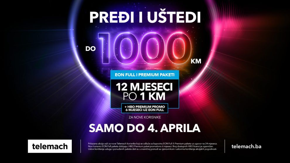 Iskoristite nikad bolju ponudu kompanije Telemach za nove korisnike i pretplatite se na jedan od EON Full paketa koji sadrže usluge televizije, interneta i fiksne telefonije po jedinstvenoj cijeni od samo 1 KM mjesečno za prvih 12 mjeseci! Ovisno od izabranog paketa, u periodu trajanja ugovora možete ostvariti uštede do 1000 KM!