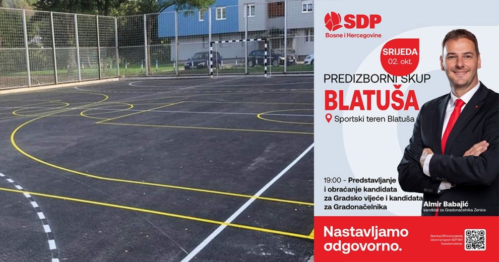 Gradska organizacija SDP BiH Zenica poziva sve građane naselja Blatuša na predizborni skup koji će se održati u srijedu, 2. oktobra 2024. godine, s početkom u 19:00 sati, na Sportskom terenu u Blatuši.