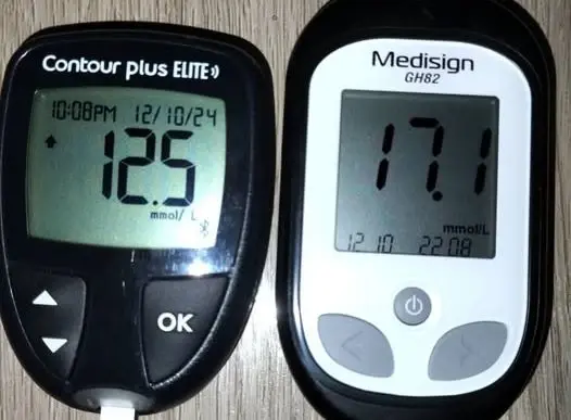 Glukometar “Medisign” (desno) pokazuje vrijednost šećera u krvi 17.1, a drugi “Contour plus Elite” (lijevo) 12.5.