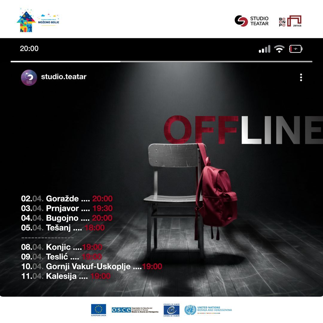 Nakon izuzetno uspješne premijere u Zenici, koju je ispratilo više od 400 gledalaca uz višeminutni aplauz, predstava „Offline“ nastavlja svoj život pred publikom širom Bosne i Hercegovine. Ova savremena teatarska priča nasatala je u produkciji Studio Teatra u saradnji sa Bosanskim narodnim pozorištem iz Zenice, u okviru projekta „Možemo bolje.“