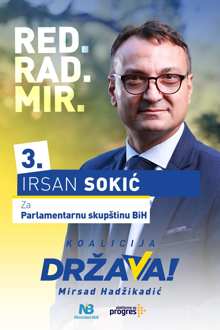 Irsan Sokić kandidat je pod rednim brojem 3. Irsan dolazi iz Breze gdje živi sa porodicom i radi i jednoj poslovnoj banci. Aktivista je brojnih sportskih, kulturnih i boračkih udruženja.Ponosno ističe da je pjesnik, a mi smo ponosni na njegovu zbirku pjesama „Mir za kojim čeznem“. Vjeruje da mir za kojim čeznu svi Bosanci i hercegovci upravo može donijeti Koalicija Država.