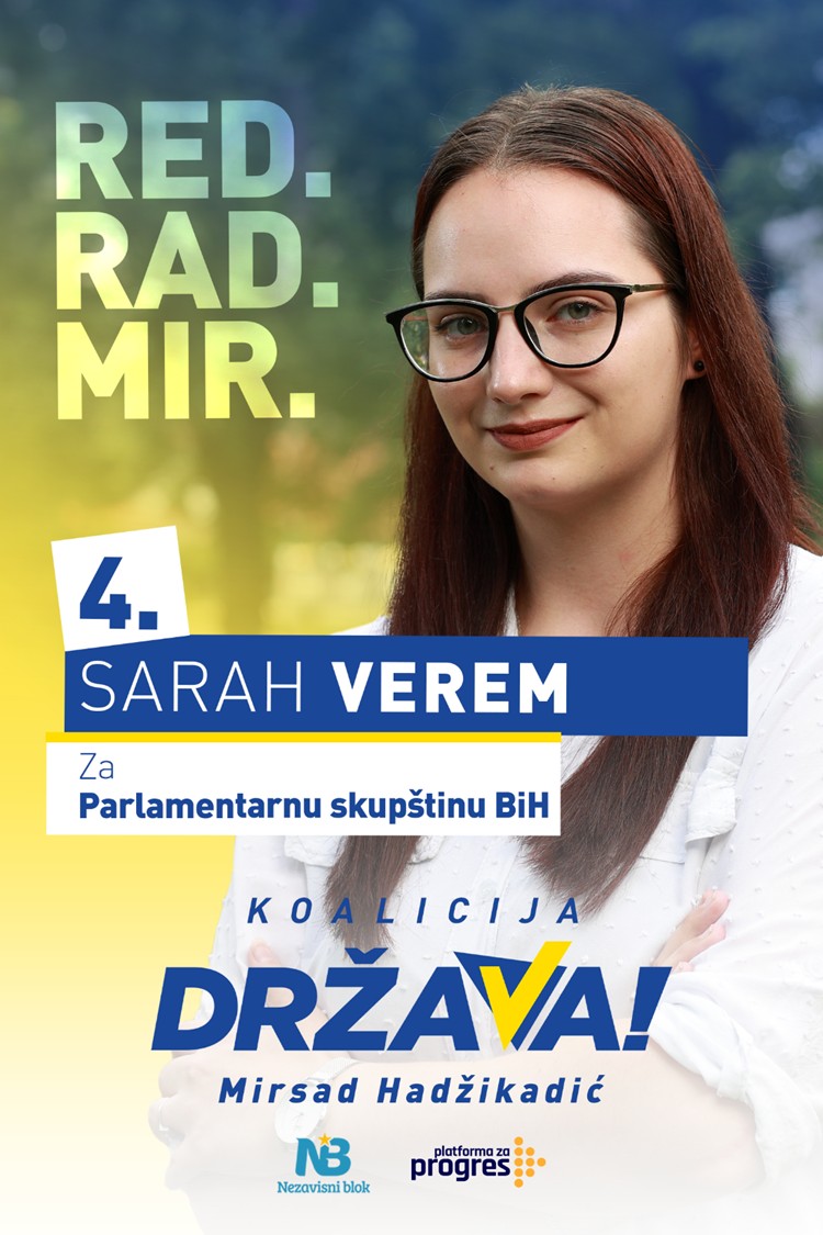 Kao predstavnica Srednjobosanskog kantona na listi Koalicije država za državni parlament nalazi se Sarah Verem, pod rednim brojem 4.