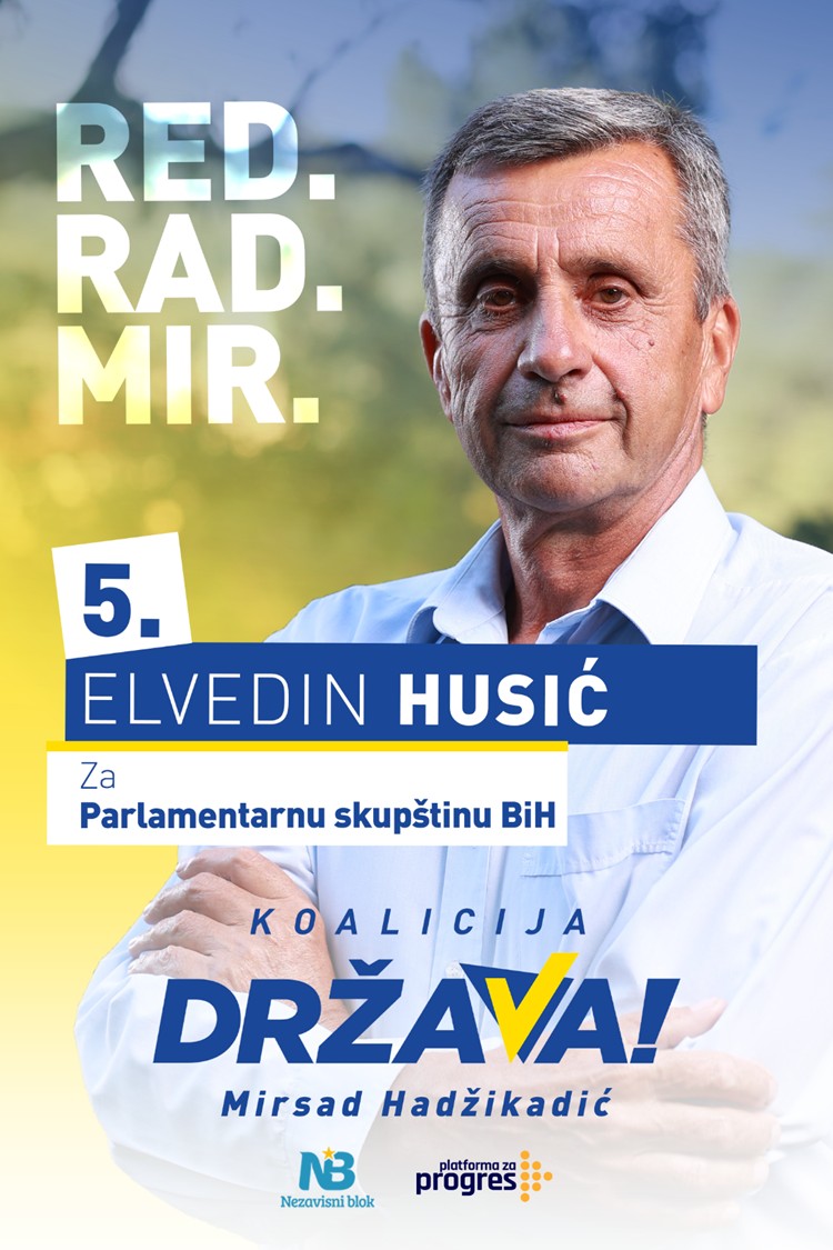 Na rednom broju 5 nalazi se Elvedin Husić. Elvedin je penzoisani politolog, a bogato radno iskustvo sticao je kao referent za opće poslove te pedagog u školi. Posjeduje političko iskustvo iz kako kaže „onog sistema“. Iako penzoner i dalje je društveno aktivan u oblasti kulture. Istinski vjeruje da ljudi okupljeni oko Koalicije država mogu donijeti promjene i uspostaviti red, rad i mir.