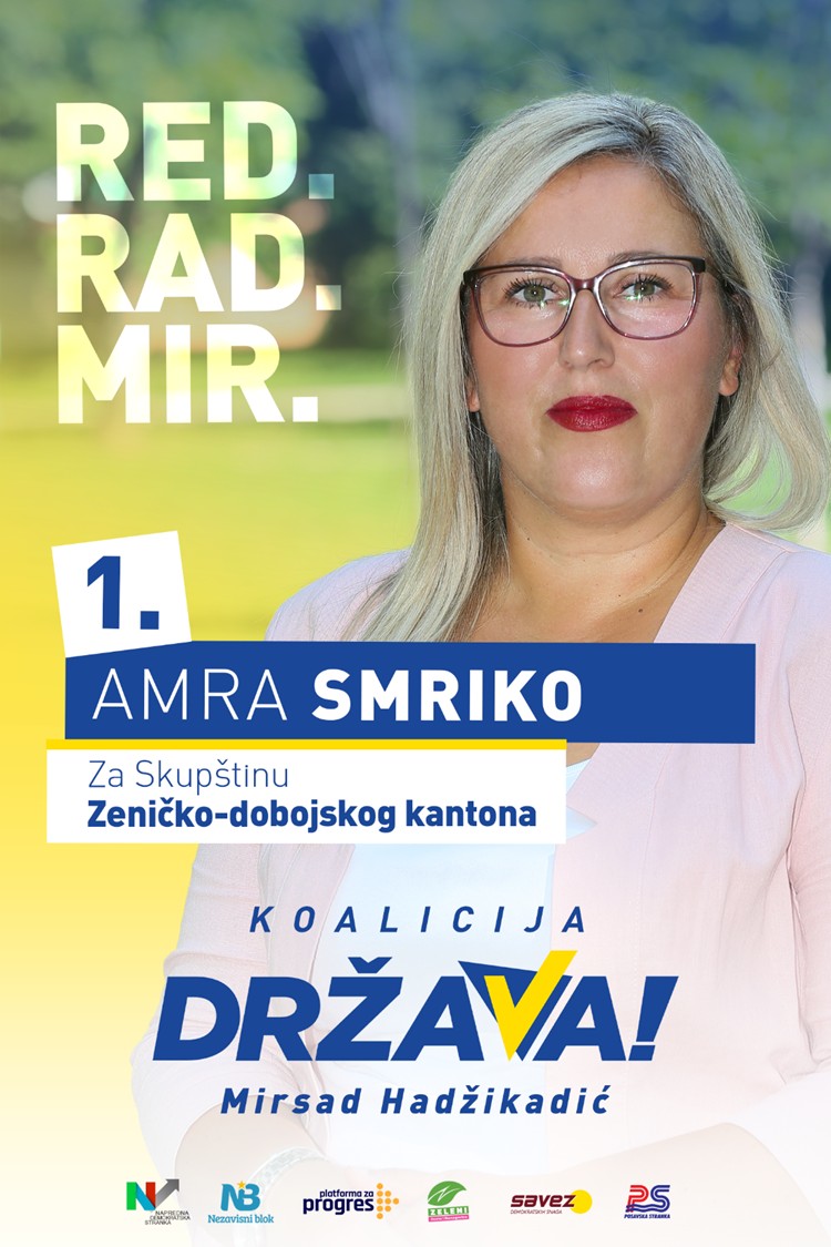 Nositeljica kandidatske liste za Skupštinu Zeničko-dobosjkog kantona je Amra Smriko. Amra je rođena Dobojka, ali živi i djeluje u Zenici. Pravnica je po struci sa višegodišnjim iskustvom rada u civilnom sektoru. Politička participacija i politički angažman nastavak su njenog građanskog aktivizma i angažmana u zajednici.