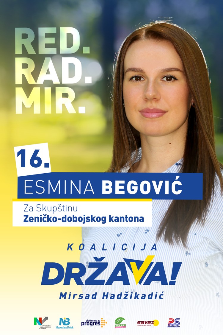 Esmina Begović je na rednom broju 16. Rođena Novotravničanka, sa trajnom adresom u Zenici. Esmina je profesorica razredne nastave, sa iskustvom u obrazovanju ali i privredi. Naime, trenutno vodi poslove u privatnoj kompaniji koja se bavi proizvodnjom bobičastog voća. Pored profesionalnog posla i majčinstva Esmina rado volontira u biblioteci. Esmina vjeruje u ideju Koalicije Država i vjeruje da će doći bolje sutra za sve nas.