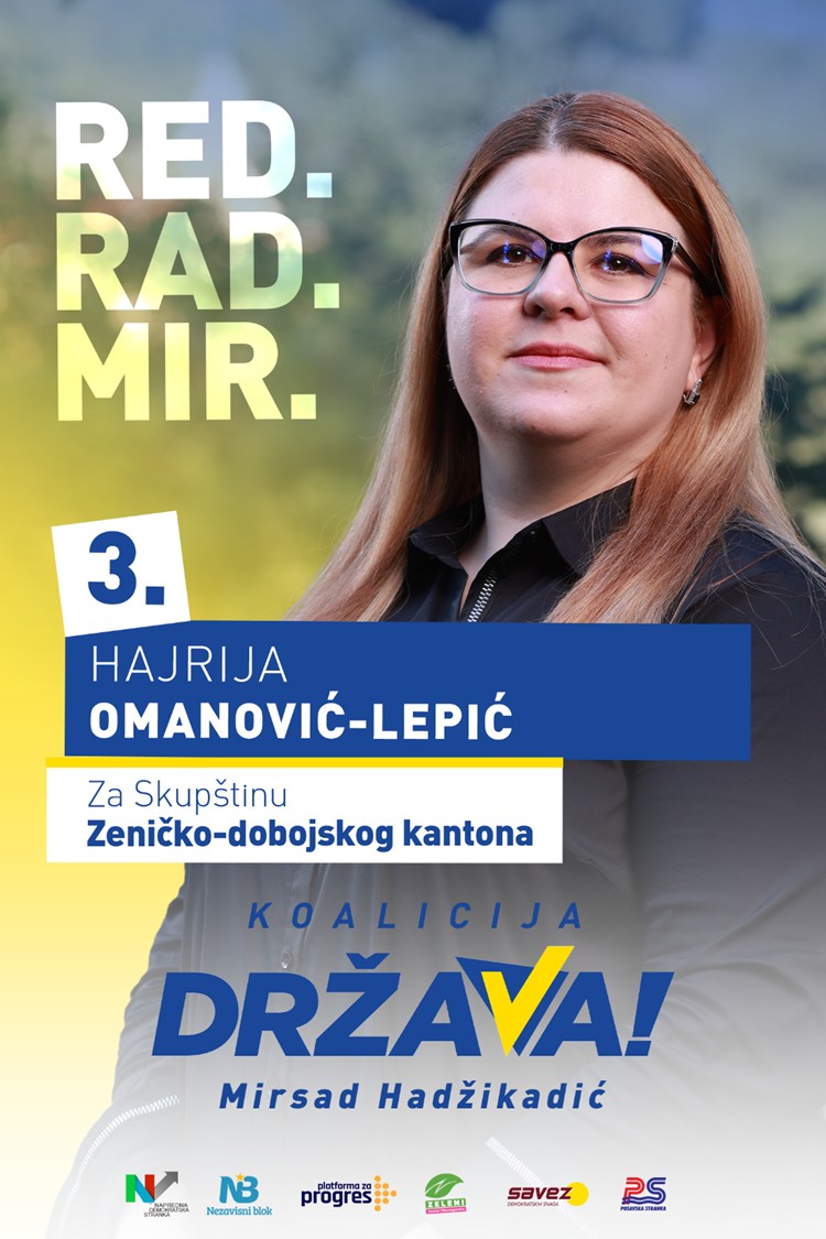 Iz Visokog nam dolazi i sljedeća kandidatkinja. Pod rednim broje 3 nalazi se Hajrija Omanović-Lepić. Hajrija je diplomirana biologinja. Trenutno je zaposlena kao asistentica u nastavi za rad sa djecom sa poteškoćama u razvoju. Shodno njenom iskustvu u obrazovanju, smatra da je reforma obrazovanja nepohodna i ključna za pozitivnu transformaciju Bosne i Hercegovine.