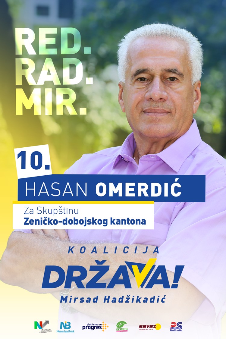 Hasan Omerdić je kandidat pod rednim brojem 10. Hasan je borac za prava radnika, penzionera, za građanska prava svih kaategorija stanovništva. Aktivno se društveno angažuje kroz razne oblike organizovanja kao što su sindikat, građanske inicijative, plenumi građana. Njegov moto je optimizam i borba do kraja, istrajnost i moralni karakter. Upravo se za te vrijednosti zalaže, acilj mu je poštena i pravna država na svakom pedlju Bosne i hercegovine.