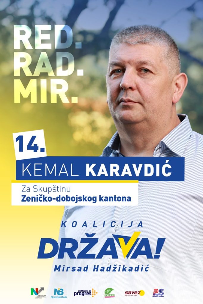 Iz Visogog nam dolazi Kemal Karavdić. Na kantonalnoj listi Kemal se nalazi pod rednim brojem 14. Po zanimanju je hemijski tehničar, a zaposlen u visočkom komunalnom preduzeću. Aktivno se bavio sportom, a Visočaci ga pamte kao nekoga ko je posebnu pažnju i podršku pružao onima koji nisu imali uslove niti potrebnu opremu za bavljenje sportom. Nerijetko ističe da među prijateljima ima ljude svih vjera i nacija što ga, po njegovom mišljenju, čini izuzetno bogatim. Do sada nije bio politički angažovan, a pluralizam i različitost Koalicije Država upravo su ga motivisala da se politički aktivira.