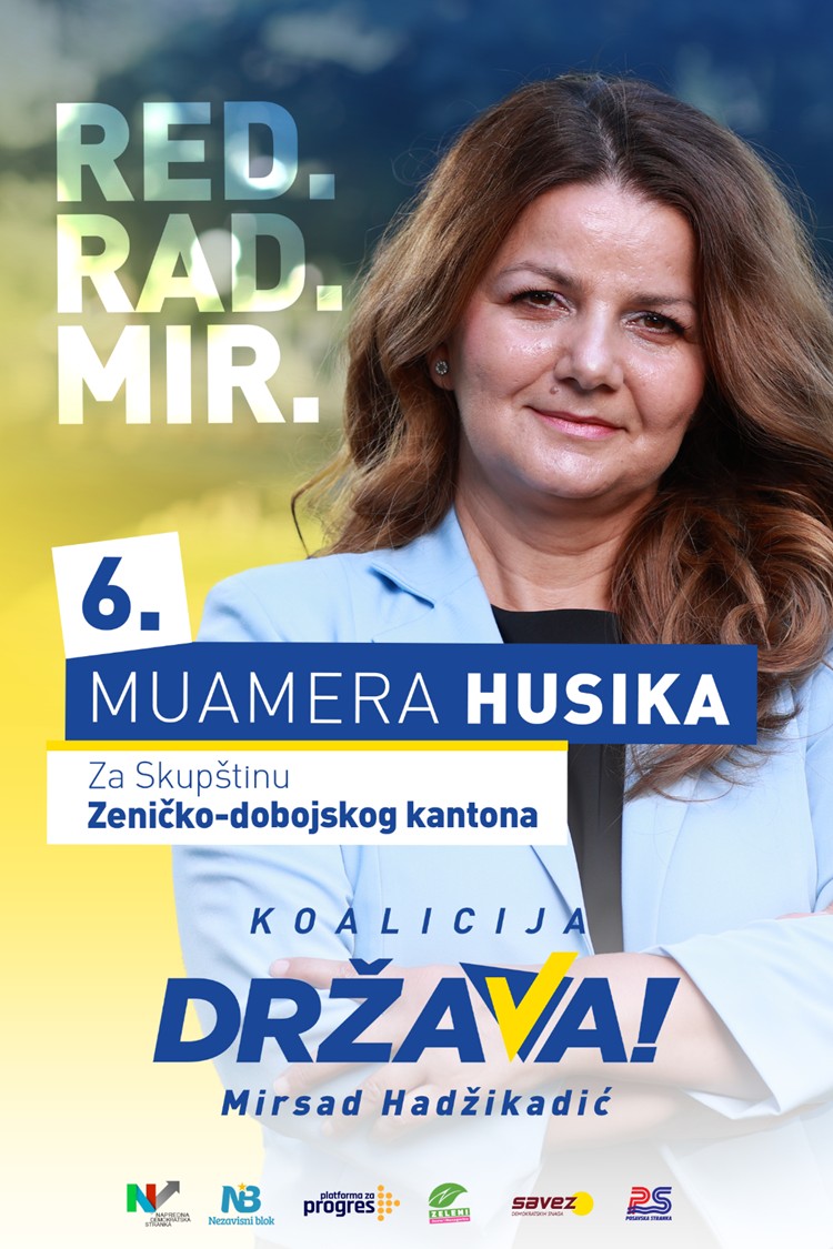 Muamera Husika se nalazi pod rednim brojem 6. Ova rođena Kakanjka i žena velikog srca brine o zdravlju naših najmlađih sugrađana. Muamera je specijalistica pedijatrije i subspecijalistica neonatolog, zaposlena u kantonalnoj bolnici. Stanje cjelokupnog društva a posebno najmlađih članova nagnalo ju je da se politički angažira i svoja stučna znanja usmjeri na kreiranje boljih zdravstvenih politika i zdravstvenog sistema za koji se posebno zalaže Koalicija Država.