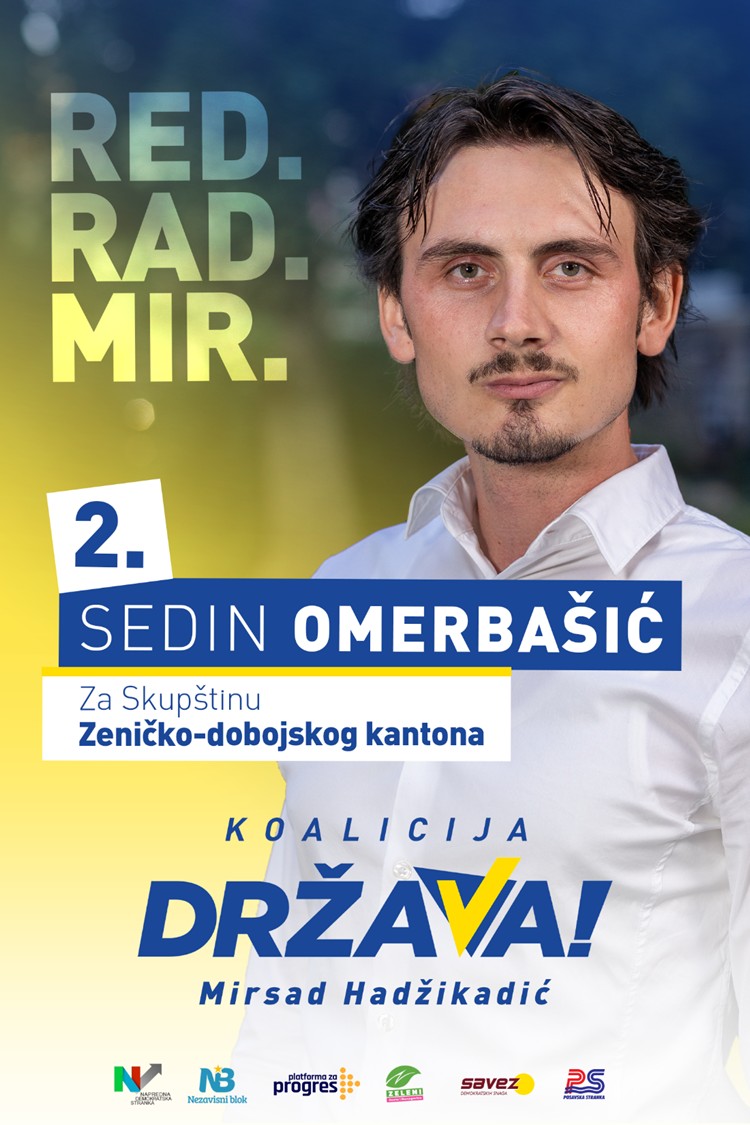Sedin Omerbašić je kandidat pod rednim brojem 2. Kantonalne liste. Ovaj Tešnjak završio je Behram-begovu medresu u Tuzli, a potom studij Orjentalne historije na univerzitetu „Al-Azhar“ u Kairu u Egiptu. Profesor je orijentalne historije, a bavi se i prevođenjem sa arapskog jezika. Sedin se zalaže za državu jednakih mogućnosti za sve njene građane i narode. Vjeruje da Koalicija Država može pokretačka snaga promjena u Bosni i Hercegovini.