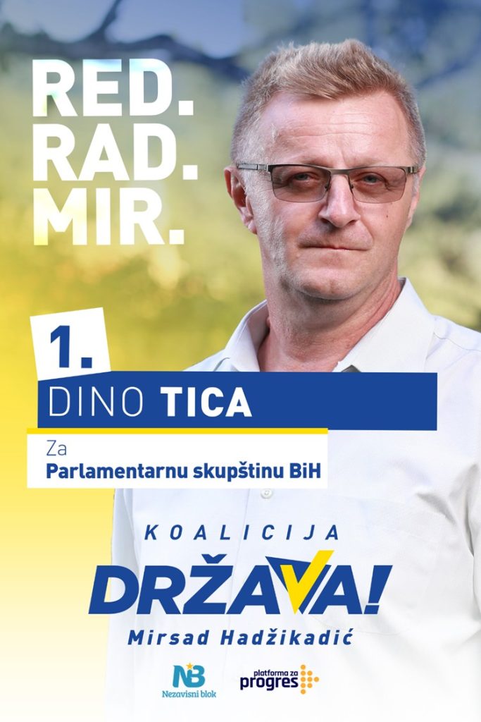 +Nositelj kandidatske liste za državni parlament je Dino Tica. Dino je magistar tehničkih nauka i trenutno na doktorskom studiju na mašinskom fakultetu u Zenici. Ovaj vrsni ekspert zaposlen je u Termoelektrani Kakanj kao rukovodilac pogona. Aktivan je član akademske zajednice kao asistent na Mašinskom fakulteteu u Zenici. Autor je više naučnih i stručnih radova u časopisima u zemlji i inostranstvu. Društve angažovan u svojoj zajednici, posebno u planiarskom društvu.