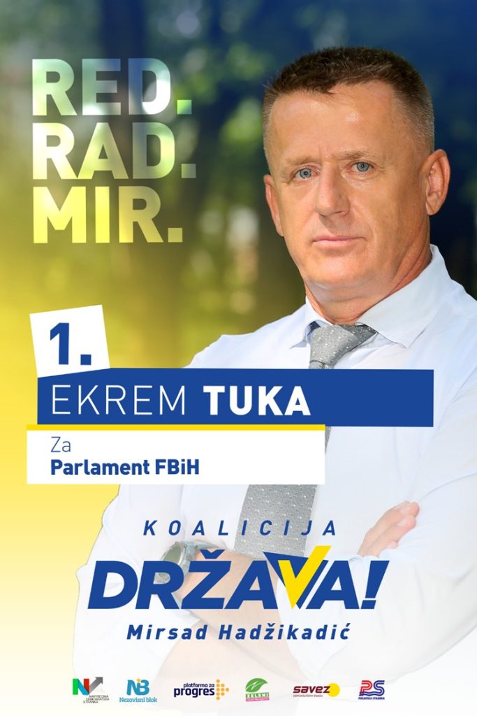 Nositelj kandidatske liste za federalni parlament iz Izborne jedinice 405 je Zeničanin Ekrem Tuka. Ekrem je penzinsano vojno loce, dokazani patriota, nositelj priznanja „Zlatni ljiljan“. Aktivni je gradski vijećnik u Gradskom vijeću Grada Zenica. Ranije obnašao funkciju Ministra za boračka pitanja u Vladi Zeničko-dobojskog kantona. Aktivan sportski radnik u više sportskih organizacija. Dao veliki doprinos u organizacji, obuci i radu službi za spašavanje ljudi i materijalnih dobara Grada Zenice i Zeničko-dobojskog kantona, posebno tokom poplava 2014. godine. Čovjek je sa višegodišnjim političkim iskustvom i vjeruje da su ljudi snaga i pokretačka energija promjena u državi.
