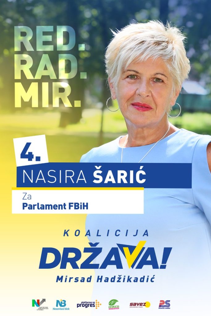 Nasira Šarić je kandidatkinja pod rednim brojem 4. Dolazi iz Zenice. Nasira je penzonerka ali u svojoj zajednici nikad nije prestala da radi. Svojim djelovanjem želi da doprinese izgradnji države u kojoj će živjeti i raditi njena djeca ali i djeca drugih roditelja.