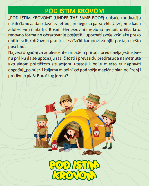 „POD ISTIM KROVOM“ opisuje motivaciju naših članova da ostave svijet boljim nego su ga zatekli. U vrijeme kada adolescenti i mladi u Bosni i Hercegovini i regionu nemaju priliku kroz redovno formalno obrazovanje posjetiti i upoznati svoje vršnjake preko entitetskih / državnih granica, izviđački kampovi za njih postaju nešto posebno.