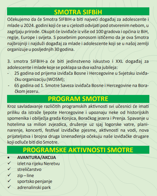 Smotra Saveza Izviđača Federacije BiH (SIFBIH), okuplja preko 1000 učesnika i gostiju, iz više od 30 gradova i 6 zemalja, čineći je najvećim organizovanim boravkom u prirodi za mlade u Bosni i Hercegovini. Osmodnevni događaj, koji se poklapa sa važnim jubilejima, nudi učesnicima priliku za sticanje vještina, iskustava i prijateljstava kroz programe fokusirane na sigurnost, zaštitu životne sredine, mirovno obrazovanje i interkulturalnu saradnju. Pored edukativnog značaja, Smotra značajno doprinosi turizmu promovišući prirodne ljepote i kulturnu baštinu Bosne i Hercegovine, te jačajući međunarodne veze i turističku ponudu zemlje.