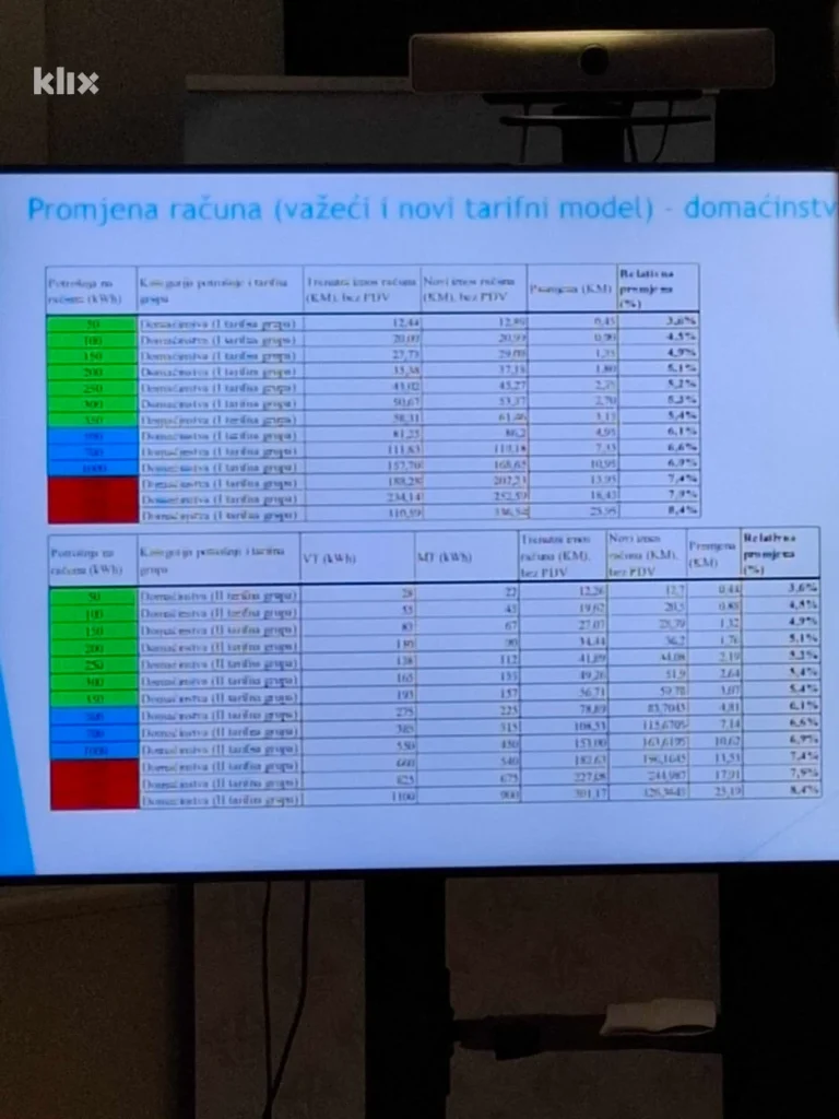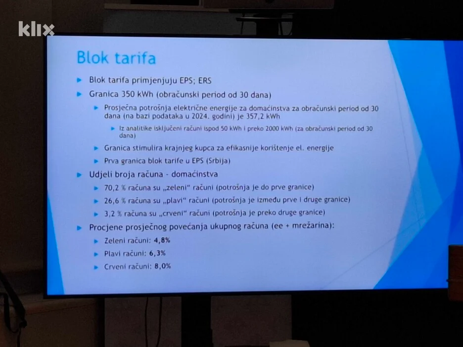 Predložene su blok tarife, a kako je Ikanović kazao imaju plavi, zeleni i crveni računi. Procjene prosječnog povećanja računa za tzv. zelene račune iznosi 4,8 posto, plave 6,3 posto i crvene 8,0 posto.