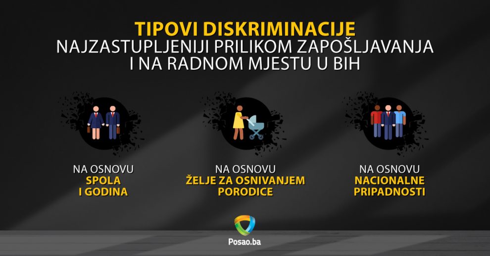 Istraživanje portala Posao.ba pokazuje da se 81% ispitanika/ca susrelo sa diskriminacijom na radnom mjestu, od toga najveći procenat njih sa diskriminacijom na osnovu spola (32%), majčinstva ili trudnoće (29%), godina (28%), religije ili religijskih uvjerenja (22%). Osim toga ispitanici su se susreli i sa diskriminacijom na osnovu ekonomske pozadine, nacionalne pripadnosti, seksualne orijentacije, rase ili etničkog porijekla, invalidnosti, političkih stajališta, izgleda itd.