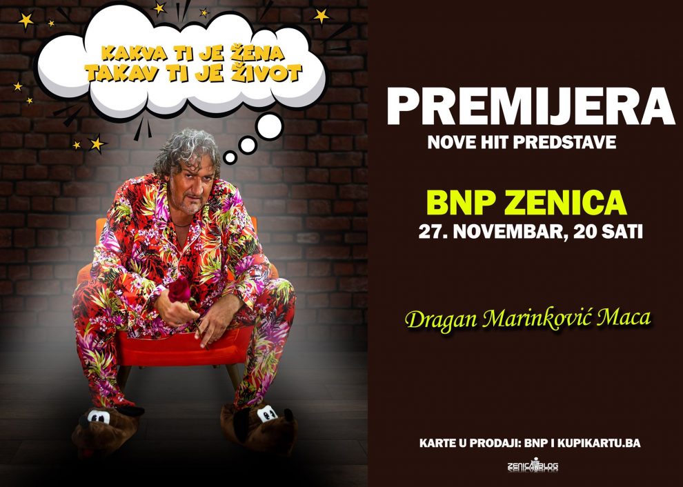 Dragan Marinković Maca će premijerno predstaviti svoju novu hit predstavu u Zenici. Predstava će se održati 27. novembra u Bosanskom narodnom pozorištu sa početkom u 21 sat.